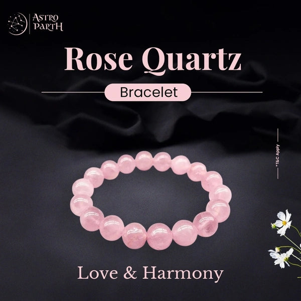 Rose Quartz Bracelet gives ideal body shape, enhances beauty & charm, improves aesthetic sense & tastes, opens heart for love, helps get proposals, treats private diseases, improves sex life, removes poverty, attracts people, develops self-love, and makes highly creative & artistic.